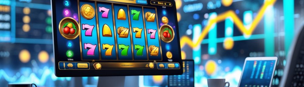 Seseorang menggunakan komputer yang menampilkan permainan slot online dengan grafik berwarna-warni dan elemen data statistik di latar belakang.