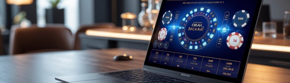 Sebuah layar komputer menampilkan permainan baccarat online dengan kartu dan chip di meja yang rapi, di sebuah ruang kerja yang modern dan terang.