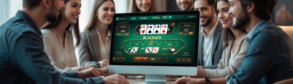 Beberapa orang muda duduk di sekitar meja dengan komputer yang menampilkan permainan blackjack online, terlihat fokus dan menikmati permainan.