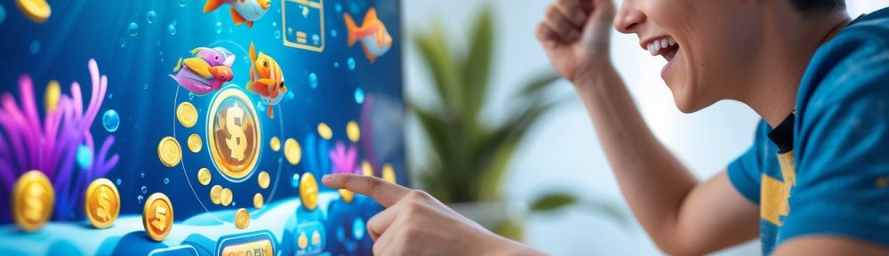 Seorang pemain muda sedang bermain game menembak ikan di perangkat digital dengan latar belakang bawah laut penuh warna.