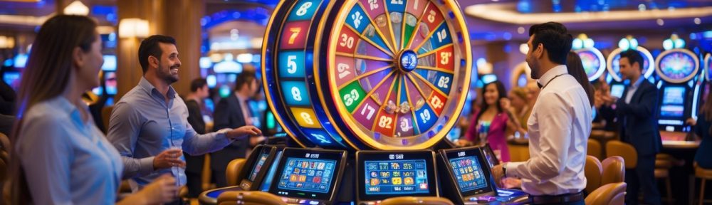 Orang-orang bermain roda besar di kasino dengan suasana yang ramai dan cerah.