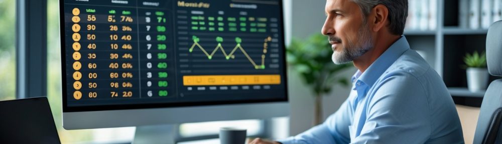 Seorang pria dewasa duduk di meja kerja modern, fokus melihat layar komputer dengan grafik dan angka, di ruangan kantor rumah yang rapi dan terang.